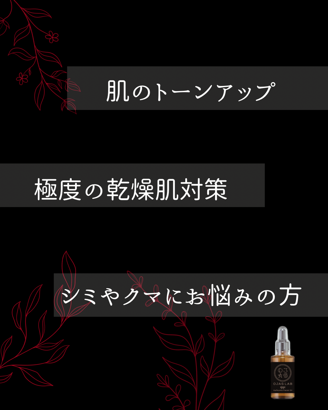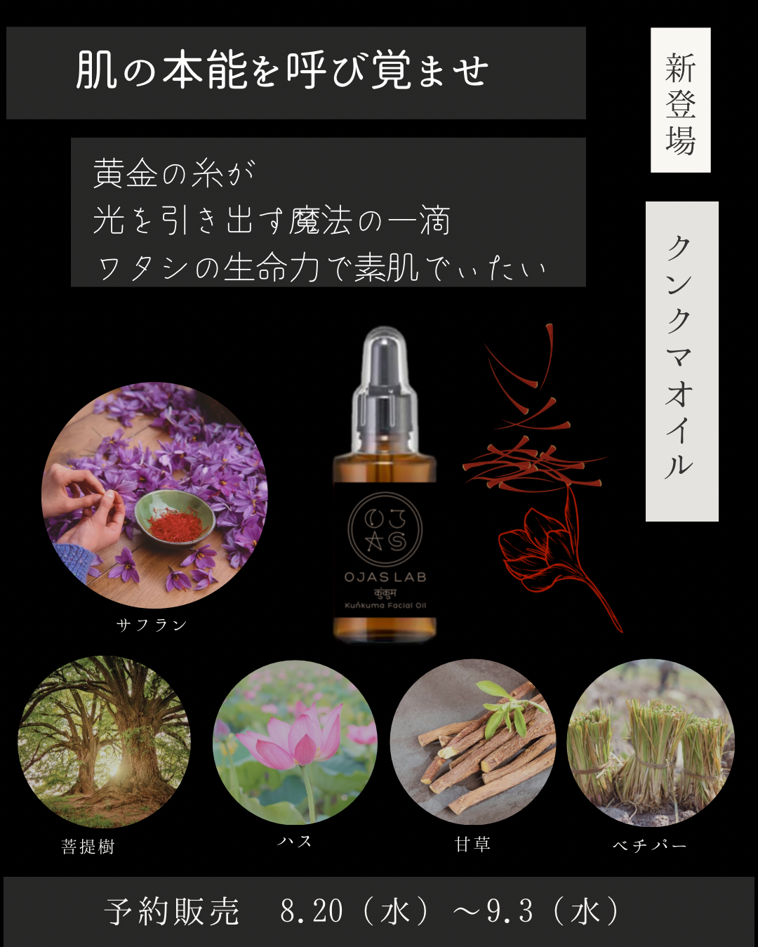 | 見たことのない朱色の特別なハーバルオイル | 日本では見たことのない朱色の特別なハーバルオイルがオージャスラボの仲間入り。このオイルには、世界で最も高額なハーブであるサフランが贅沢に配合されています。これは、インドでは古くからのレシピに基づいています。 |